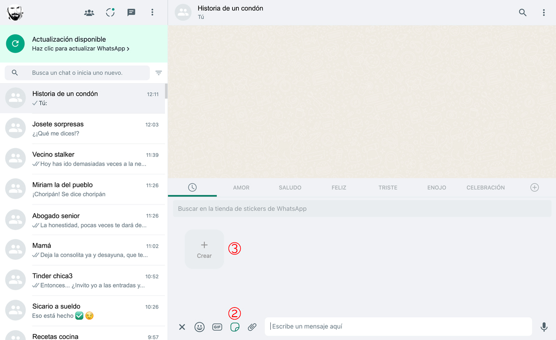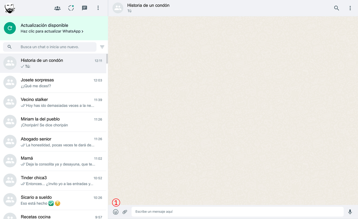 Una vez en WhatsApp Web, en cualquier conversación, accede al apartado de Emoticonos (1).