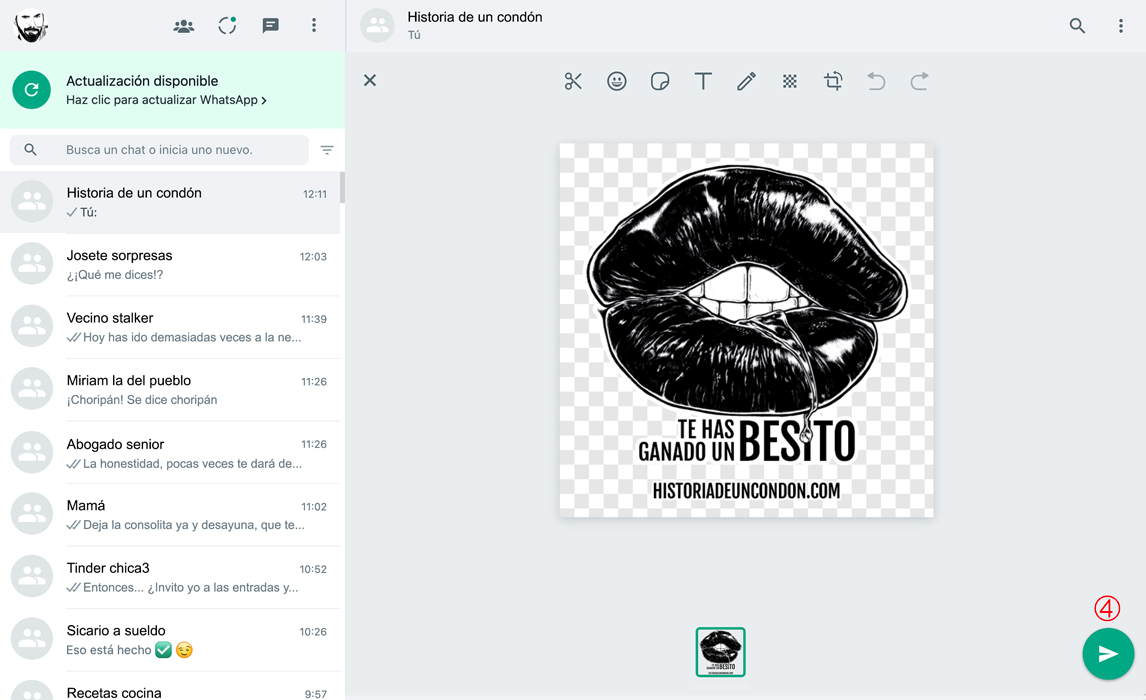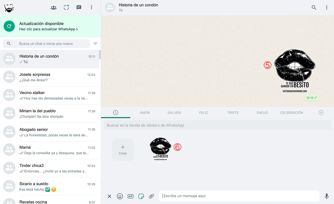 Se creará el sticker y aparecerá en la conversación (5) y en el apartado Stickers (6).