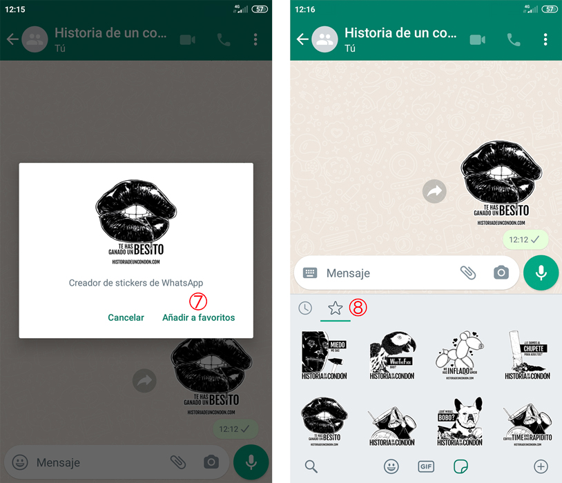 Una vez hayas cargado los stickers, desde WhatsApp versión móvil (no Web) podrás, pulsando sobre cada sticker, añadirlo a Favoritos (7) para que se quede almacenado (8) y poder utilizarlo siempre que quieras en tus conversaciones.